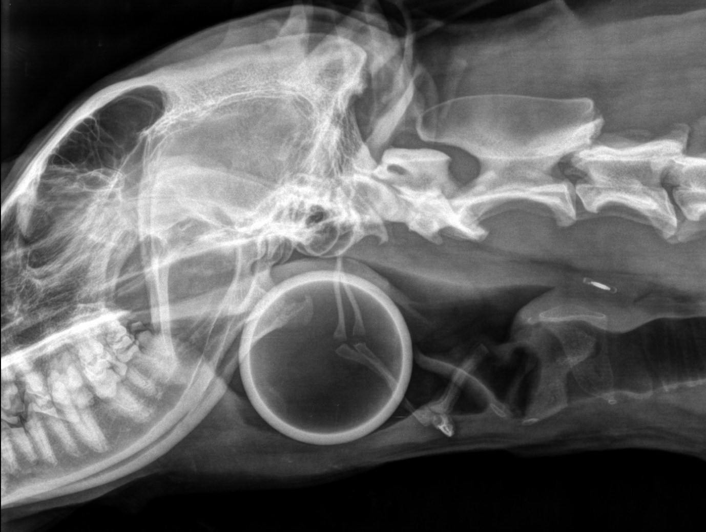 Une chienne berger allemand âgée de 3 ans est référée à V24 suite à un iléus gastro-intestinal. Elle présente du ptyalisme et des vomissements depuis 4 jours. L’examen clinique : montre un ptyalisme intense, une gène à la déglutition, une dilatation abdominale modérée avec tympanisme gastrique et des bruits inspiratoires augmentés de type cornage associés…